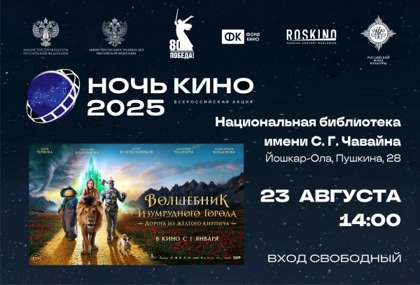 Национальная библиотека имени С. Г. Чавайна в Йошкар-Оле станет одной из площадок для проведения Всероссийской акции «Ночь кино – 2025». В библиотечном кинозале для показа выбран красочный семейный фильм-фэнтези «Волшебник Изумрудного города. Дорога из жёлтого кирпича» 2024 года.