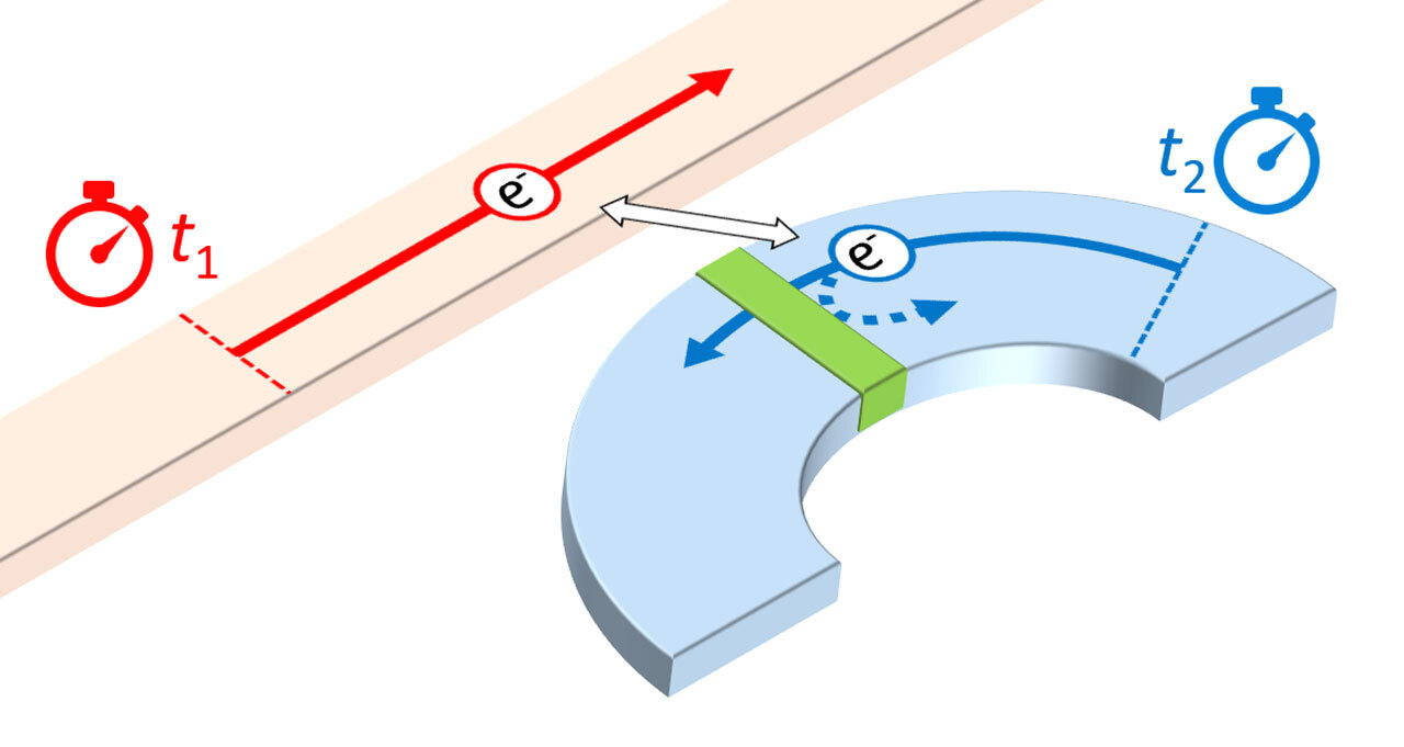Обнаружение одиночных баллистических электронов с высоким временны́м разрешением. Прохождение «чзондирующего» электрона (синие стрелки) через барьер (зеленый) в нижнем канале нарушается кулоновским взаимодействием с «детектируемым» электроном в верхнем канале (красная стрелка).