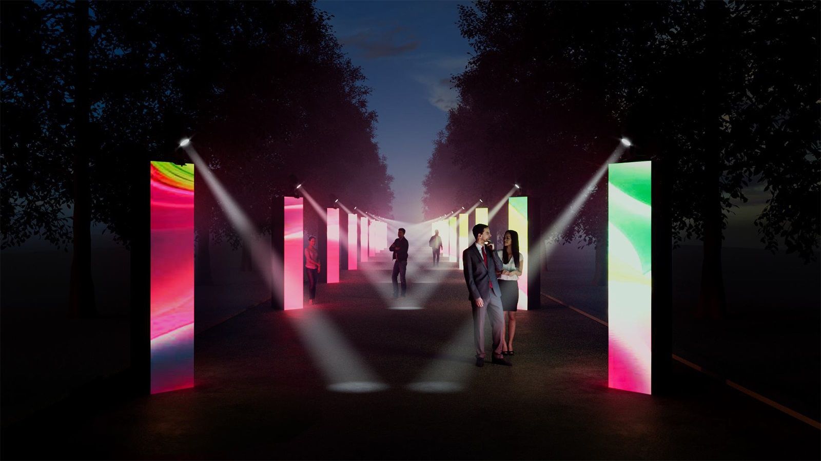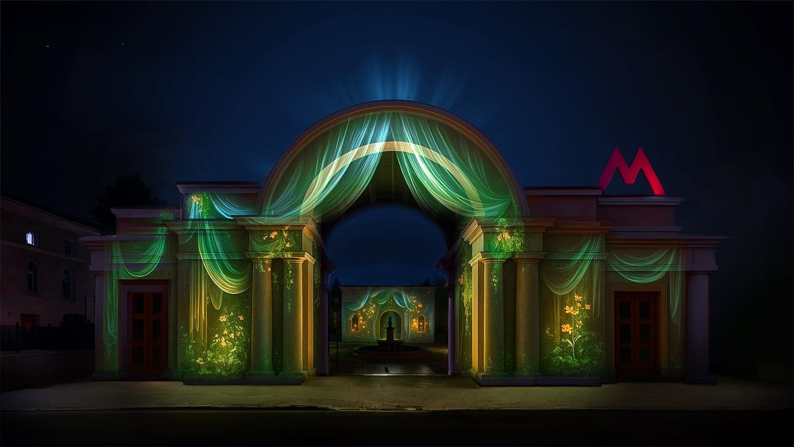 Центральной визуальной инсталляцией будет LED-туннель, который преобразит главную аллею территории кинопарка в кинематографический коридор света и движения. В декорациях «Москва 1940-х годов» с помощью видеомэппинга оживут архивные сюжеты о жизни города, переосмысленные через призму современных визуальных технологий. Главным экраном для этих проекций станет фасад башни с часами.