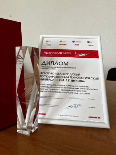БГТУ имени Шухова удостоен диплома за высокие достижения в командном рейтинге, кооперацию команды в тестировании технологических решений, развитии и продвижении проектов, развитии качества акселерационных программ. Награду для вуза из рук заместителя министра науки и высшего образования Российской Федерации Ольги Петровой получила проректор по кадровой политике и административно-правовой работе Оксана Владимирова. Технолог второй среди вузов и четвёртый в общем рейтинге вместе с НПЦ. Также университету были вручены символы «Архипелага-2025» — стеклянные статуэтки в виде архипелага за вклад в технологический суверенитет, в развитие кадров в отрасли беспилотных систем, в сетевое взаимодействие между университетом и отраслью беспилотных систем.