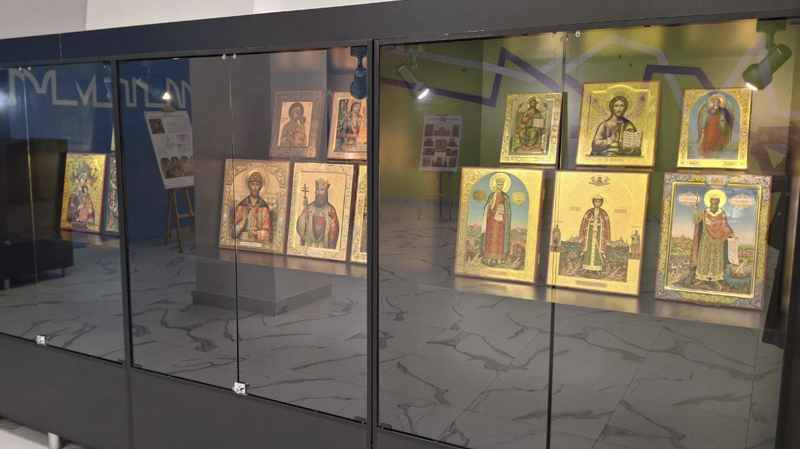 Рядом с выставкой картин — информационно-художественные плакаты иконописной мастерской «Лик» Сергея и Майи Гусариных. В школе создаются уникальные образы, которые также были представлены посетителям выставки за стеклом стеллажей.