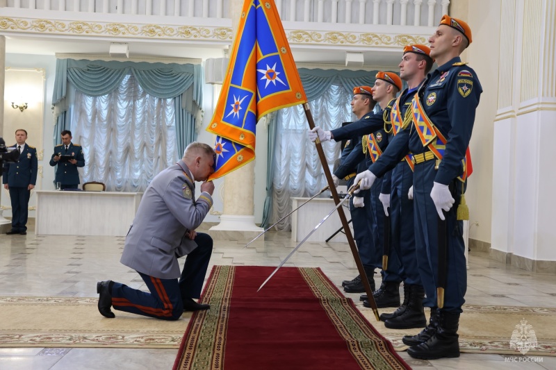 Торжественным маршем прошла знаменная группа. В присутствии личного состава и приглашенных гостей генерал-майор Марат Латыпов, преклонив колено, попрощался со Знаменем.