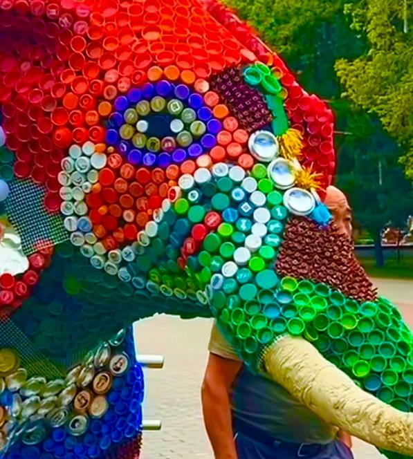 В Караганде поселился слон. Конечно, не настоящий, но очень милый: его собрали из 10 тысяч крышек от напитков, десятков пластиковых деталей, железных банок и даже ручек от зонтиков.