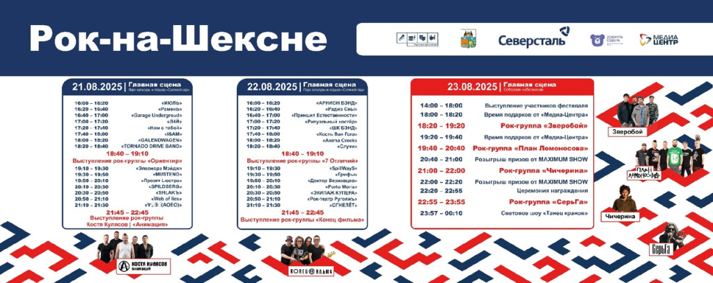 «Рок-на-Шексне» – не просто серия концертов, а фестиваль-конкурс: в июне организаторы принимали заявки от музыкальных групп и в итоге определили 30 финалистов. Они выступят 21 и 22 августа в парке «Соляной сад». Шесть лучших коллективов пройдут в суперфинал – он состоится 23 августа на сцене, которую установят прямо на реке Шексне. Председателем жюри станет Сергей Галанин из рок-группы «СерьГа». Победители получат крупные денежные призы.