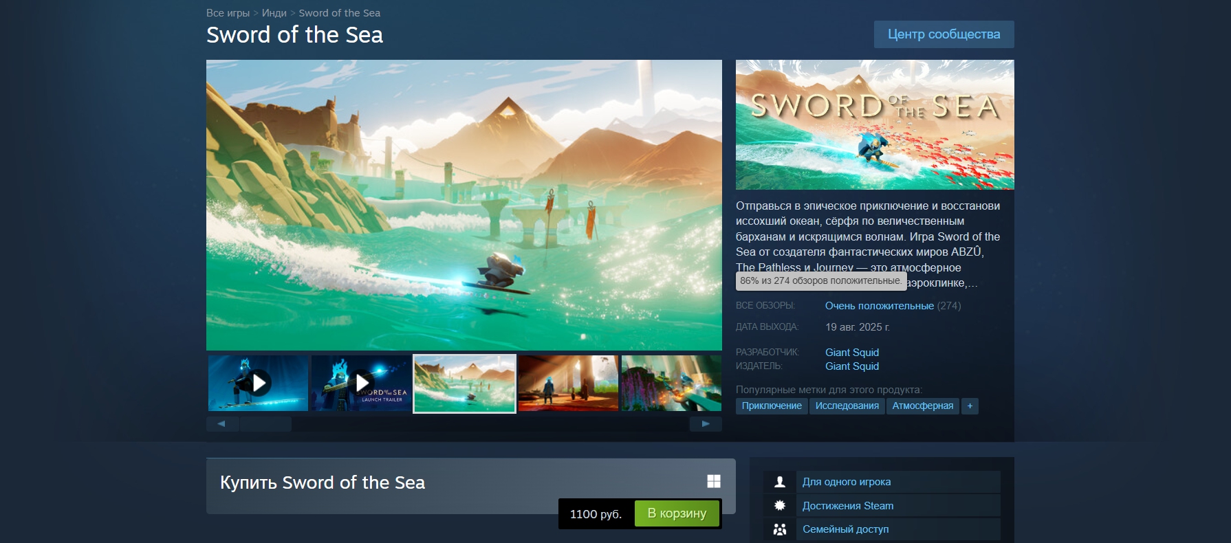 Вслед за прессой Sword of the Sea оценили и обычные игроки. В целом новинка от авторов ABZU и The Pathless оставила приятные воспоминания у геймеров, запомнившись им яркими видами, захватывающей атмосферой и музыкой. Однако также Sword of the Sea несколько смутила рецензентов своей ценой вкупе с небольшой продолжительностью. Адвенчура стоит 1 100 рублей и проходится за несколько часов: