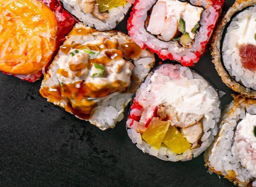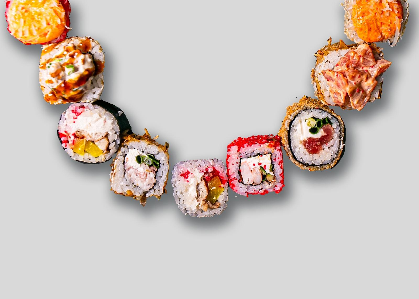 Фудзи (200 г, 250 ₽), Мясной ролл (275 г, 330 ₽), Тартар с угрём (280 г, 550 ₽), Ролл с тунцом (280 г, 470 ₽), Авокадо и манго (240 г, 250 ₽).