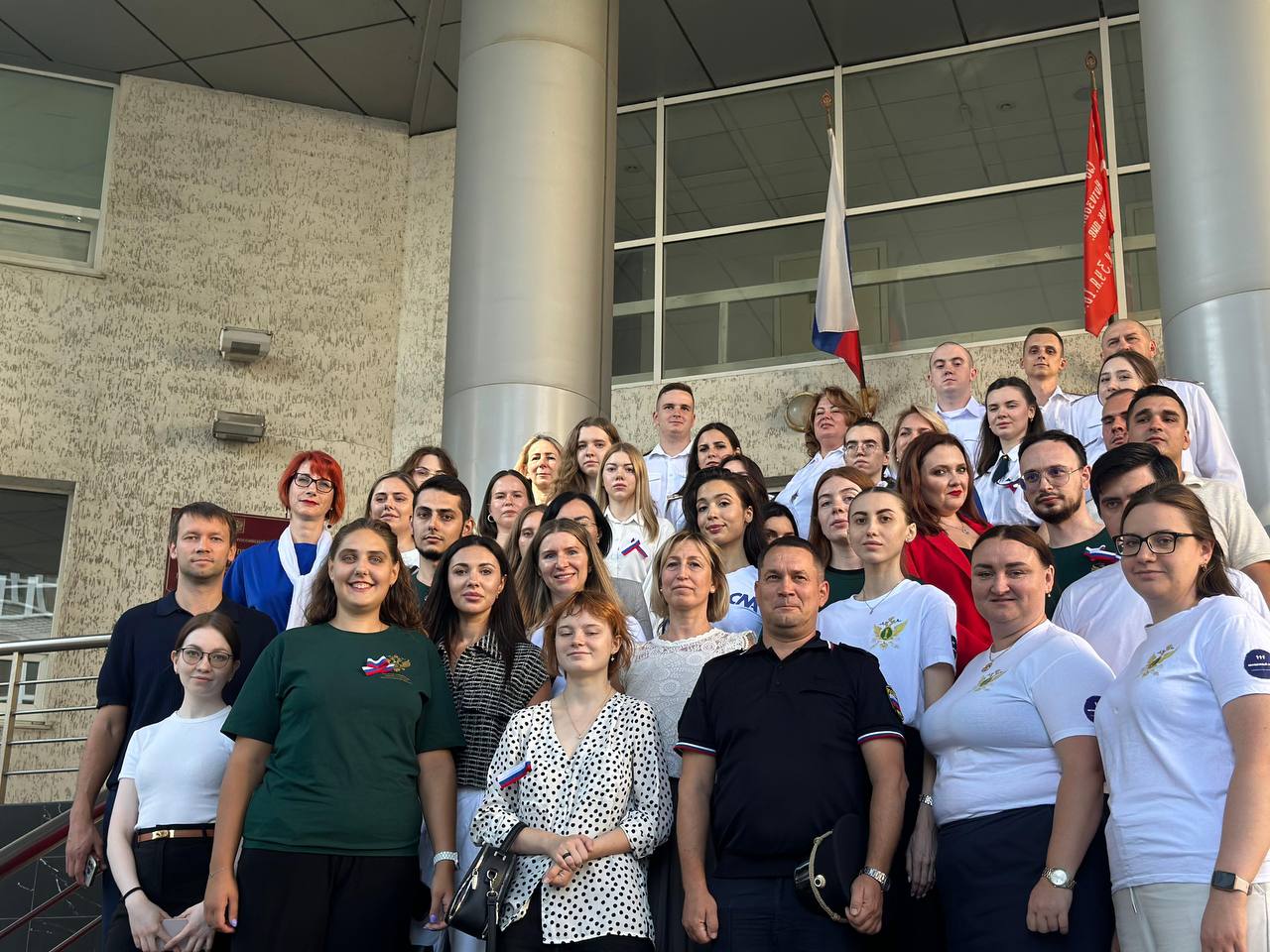 Представители Молодежных советов Главного управления, ГУФСИН России по Ростовской области, ГУФССП России по Ростовской области, ФБУ Южный РЦСЭ Минюста России, УЗАГС Ростовской области, Совета молодых адвокатов Ростовской области, Нотариальной палаты Ростовской области, Территориального органа Федеральной службы по надзору в сфере здравоохранения по Ростовской области, Управления Росреестра по Ростовской области, а также стажер Благотворительного фонда «Белый Ангел» Нина Смирнова на набережной Донской столицы развернули большое полотно российского триколора.
