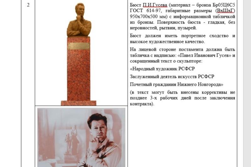 Бюст необходимо установить в Сквере Народного художника РСФСР Гусева в течение 30 дней со дня заключения контракта. Сам памятник должен быть выполнен из бронзы и иметь «портретное сходство и высокое художественное качество». На лицевой стороне постамента должна быть табличка с надписью «Павел Иванович Гусев» и сокращенный текст о скульпторе: «Народный художник РСФСР, Заслуженный деятель искусств РСФСР, Почетный гражданин Нижнего Новгорода».