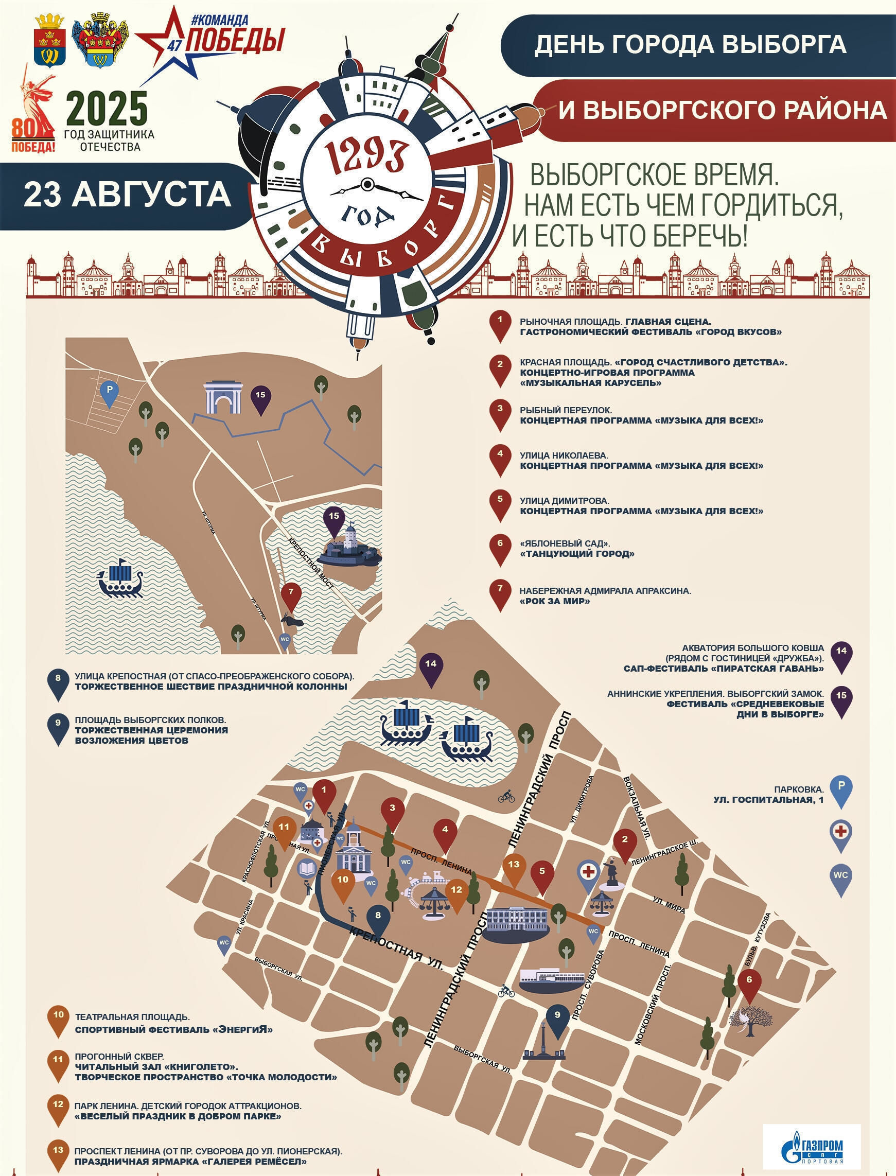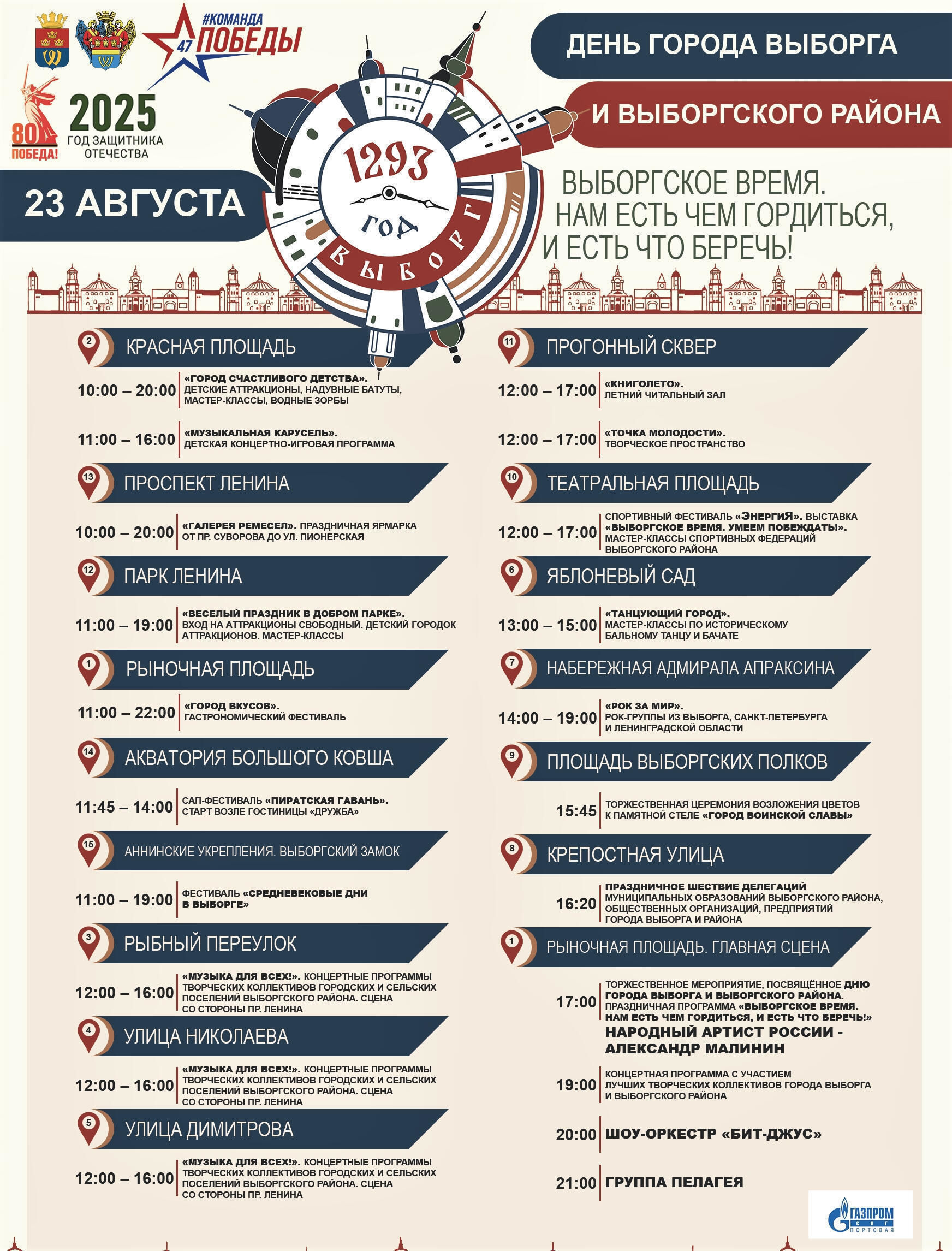 Торжественная часть придется на вторую половину дня. На площади Выборгских Полков возложат цветы к стеле «Город воинской славы», затем состоится шествие праздничной колонны. С пяти часов вечера основной площадкой станет Рыночная площадь. В вечерней программе: концерт с участием группы «Пелагея», народного артиста России Александра Малинина и шоу-оркестра «Бит-Джус».