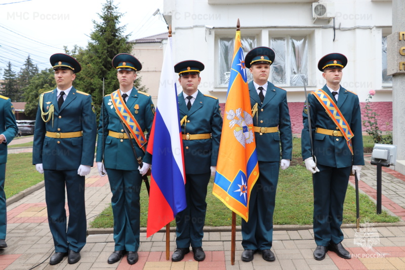 Сегодня у памятного знака пожарным и спасателям Главного управления МЧС России по Курской области состоялось торжественное мероприятие, посвященное Дню Государственного флага Российской Федерации.