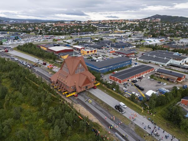 Церковь Kiruna Kyrka перевозится по дороге на новое место в Кируне, Швеция.