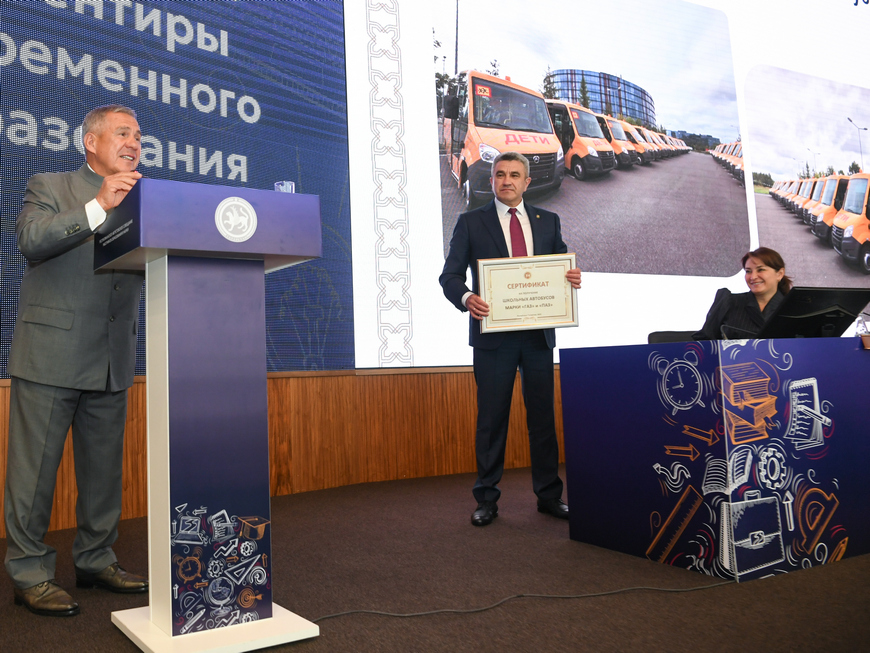 В завершение совещания раис Татарстана вручил педагогам государственные награды Российской Федерации и Республики Татарстан. Образовательным учреждениям также вручили сертификаты на 62 школьных автобуса.
