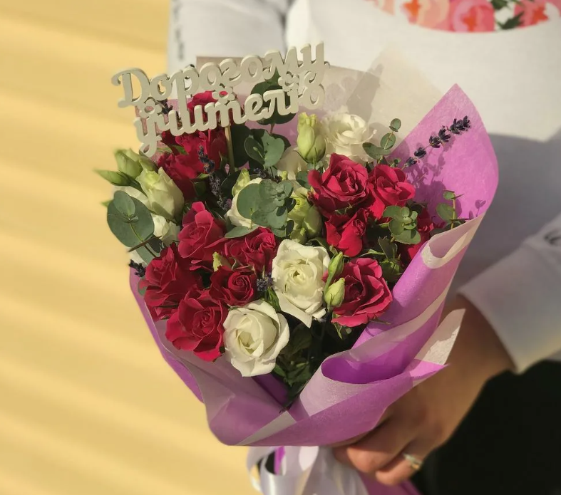 Дополнить букет можно зеленью или небольшими нейтральными цветами, чтобы подчеркнуть красоту роз и сделать композицию более сбалансированной. Такой букет будет не только красивым, но и трогательным знаком внимания, который обязательно оценит ваш учитель.