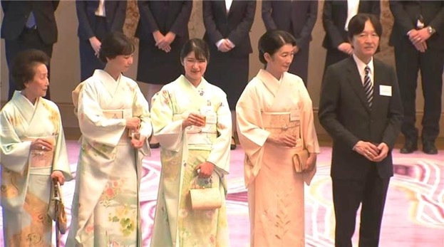 Императрица и принцессы носили кимоно фурисодэ, которое обычно характеризуется очень длинными рукавами, но существуют варианты с более короткими. Этот традиционный наряд сшит из ткани с цветочными, облачными и веерными узорами. Фурисодэ надевают на торжественные мероприятия, подчеркивая престижность приёма.