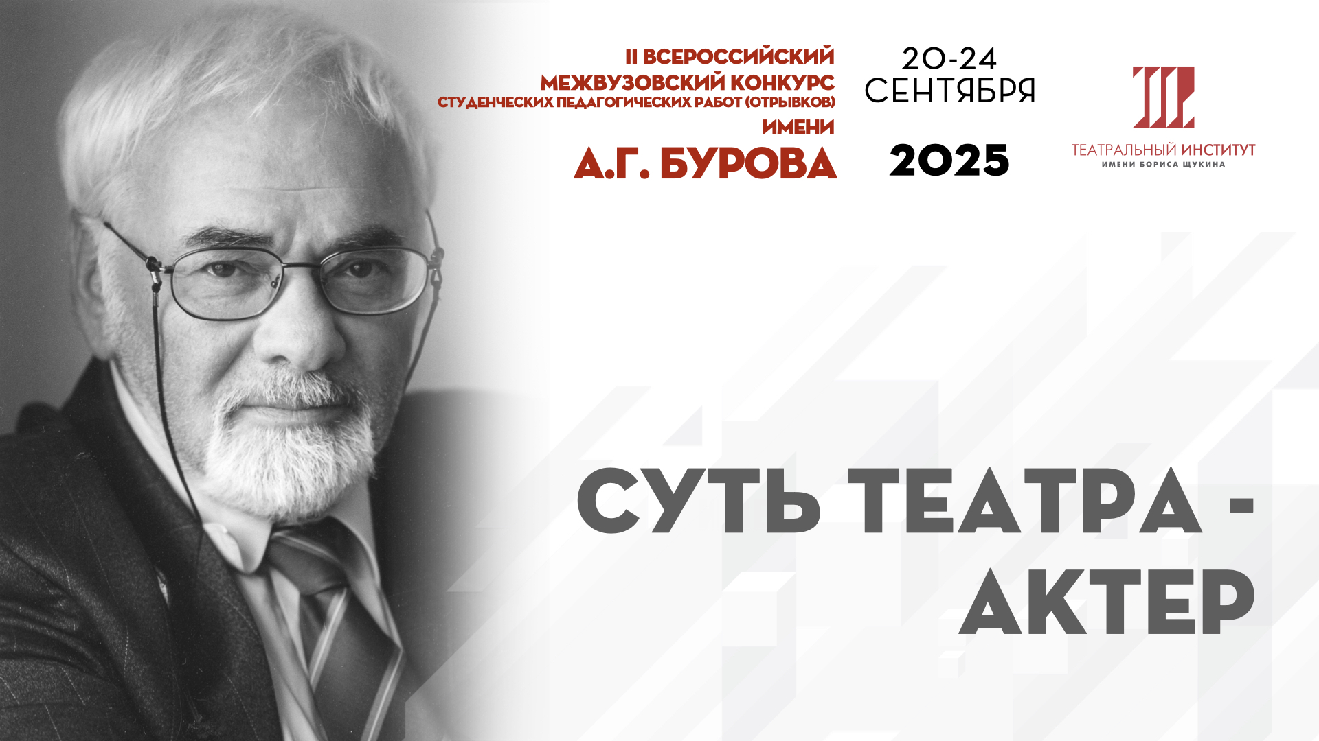 20-24 сентября 2025 года в Театральном институте имени Бориса Щукина пройдет III Всероссийский межвузовский конкурс педагогических отрывков имени заслуженного деятеля искусств РФ А.Г. Бурова «Суть театра – актер».
