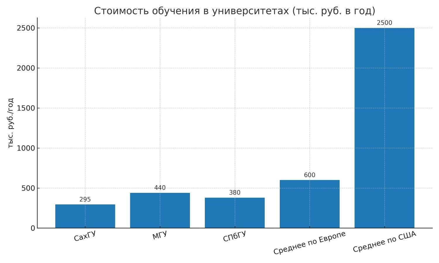 Учеба на Сахалине обходится дороже, чем в Краснодарском крае. По данным НИУ ВШЭ, в 2024 году стоимость платного обучения здесь составляла около 295 тысяч рублей в год. Для сравнения, на Кубани аналогичный показатель гораздо бюджетней — 162 тысячи рублей.