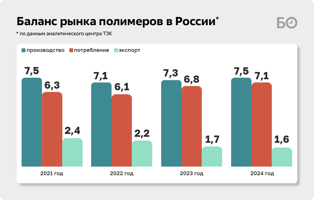 За 2024 год в России было произведено около 7,5 млн т крупнотоннажных полимеров (полиэтилен, полипропилен, поливинилхлорид, полистирол, полиэтилентерефталат). Из них на экспорт ушло 1,6 млн т — на 30% меньше, чем было в «досанкционном» 2021-м.