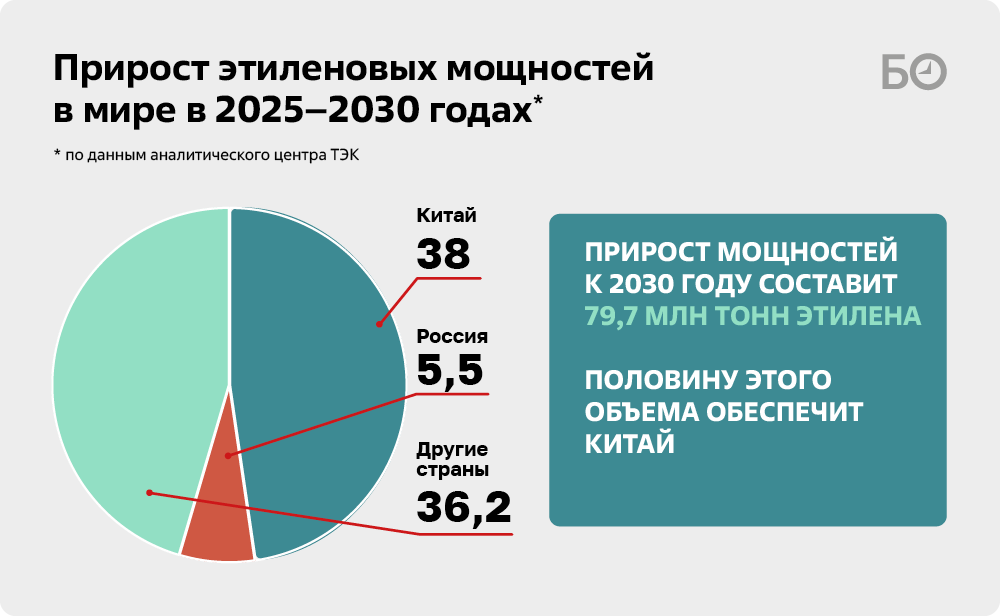 Надежды на то, что китайцы умерят аппетиты, нет. В 2025–2030 годы в мире ожидается ввод новых мощностей по этилену в объеме 79,7 млн т — из них 38 млн т (почти 50% от общего «пирога») обеспечит КНР. Такими данными с «БИЗНЕС Online» поделился эксперт департамента по аналитике в нефтехимической отрасли аналитического центра ТЭК (АЦ ТЭК) Михаил Спиров.