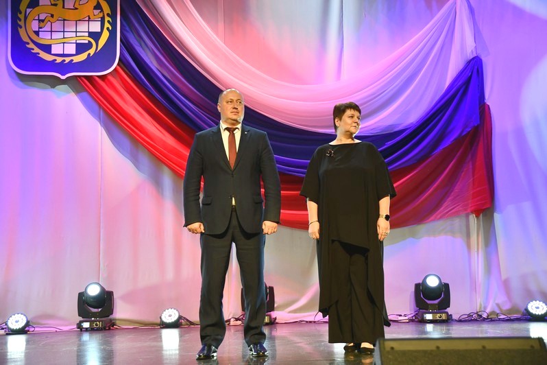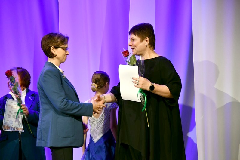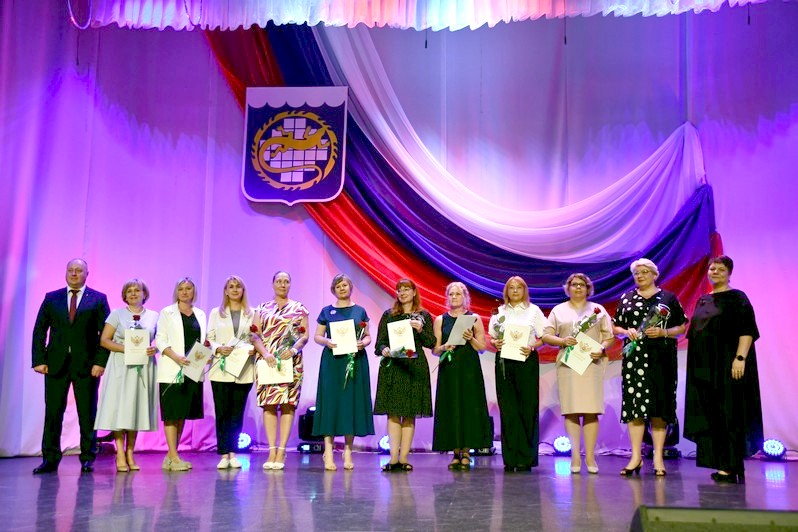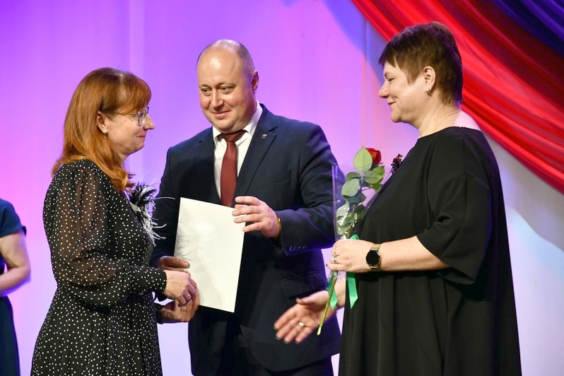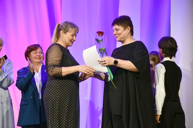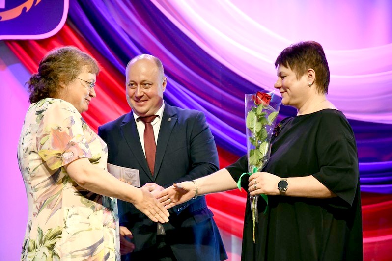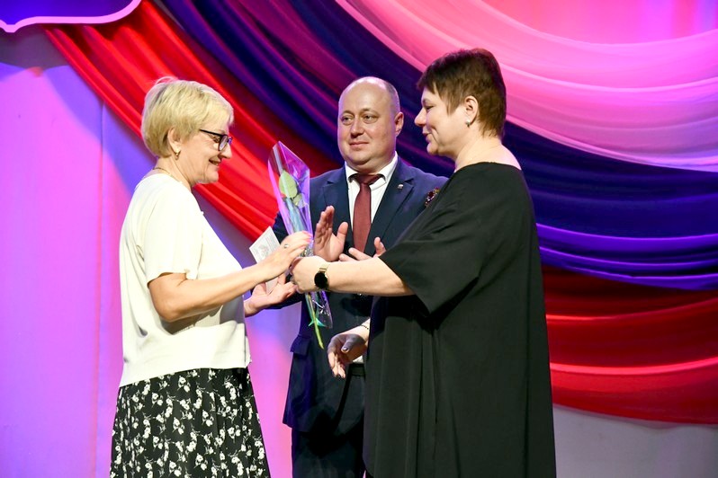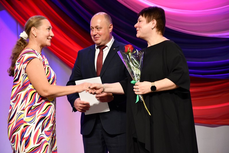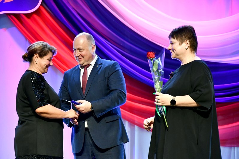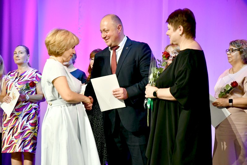 Для вручения наград на сцену был приглашен глава округа Сергей Гергенрейдер. Он поздравил ряд педагогов с присуждением звания «Почетный работник сферы образования Российской Федерации», с получением нагрудного знака «За верность профессии», с награждением Почетной грамотой Министерства просвещения Российской Федерации.