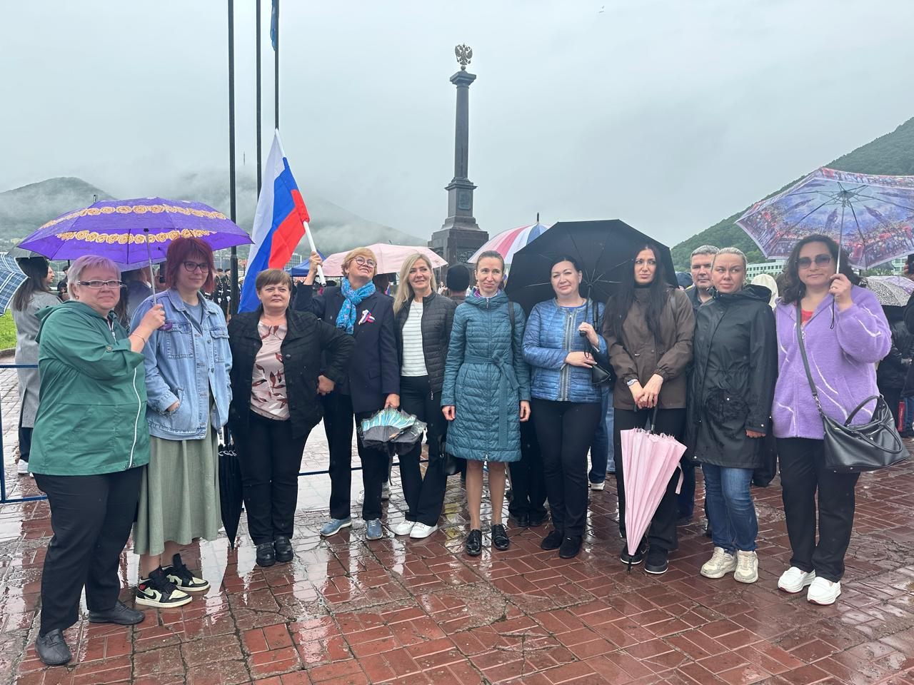 Мероприятие началась с торжественного выноса Государственного флага Российской Федерации. Знаменная группа отдельной гвардейской дважды Краснознаменной Краснодарско-Харбинской бригады морской пехоты Тихоокеанского флота пронесла флаг по центральной площади города. Под звуки Государственного гимна Российской Федерации военнослужащие осуществили церемониальный подъем флага.