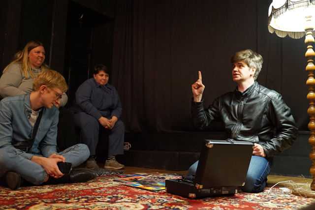 Литературный автофикшн часто связан с травмой — этого же можно ожидать и от автофикшна в театре. Спектакль Александра Савчука «ЛайкаРоллингСтоун» родился, по словам автора, потому что была острая необходимость рассказать, и было «ощущение вопля». Что, конечно, общая «движущая сила» для всего автофикционального. Но в этом конкретном случае невозможно вычленить одну травму, из которой прорастает спектакль. Травм много, они разной глубины и интенсивности, но все связаны — музыкой. Вокруг коллекции пластинок строится спектакль: какие-то из них с трудом доставались в девяностые, под какие-то автор танцевал в детстве, одна — из коллекции жены, другую он обязательно поставит послушать сыну. Савчук сидит на ковре, перед ним проигрыватель. Одно (чаще всего тревожное) воспоминание — одна песня, и кажется, что пластинки в большей степени управляют действием, чем автор. Они заставляют вспоминать все больше и больше историй, разворачивающихся на фоне мрачного Усть-Илимска. Зритель может выбрать: сесть в зале на стуле или расположиться на ковре вокруг проигрывателя. Камерность и «одомашнивание» исполнения, которые очень хороши в задумке, на практике оказались трудно выполнимыми и играли скорее против исполнителя, который мизансценически оказался расположен ниже зрителя. Полного смешения зрительного зала и сцены не получилось, но канонического строгого деления — тоже. Там, где намечались отсутствие иерархий и горизонтальность, возник «перевертыш» — и ощущение скомканности.