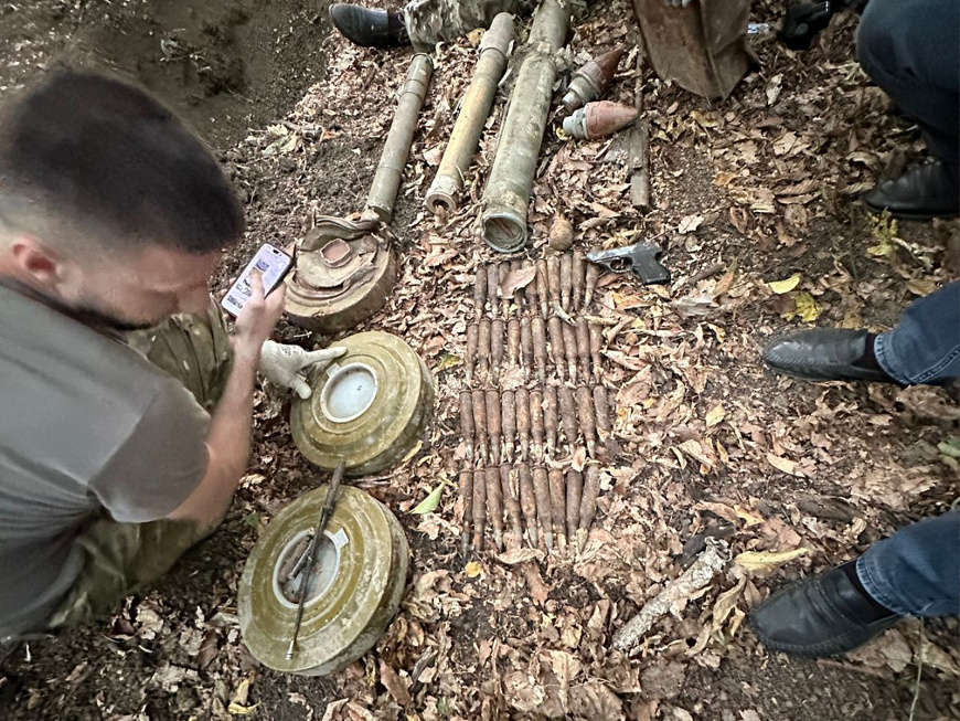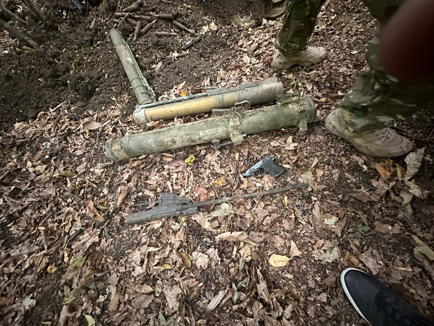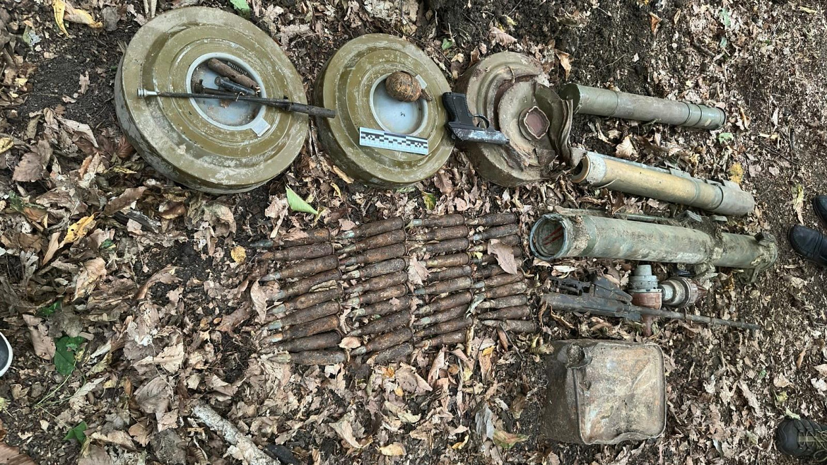Из тайника, который находился в яме на глубине около 80 сантиметров, было изъято 2 гранатомёта (РПГ-18 «Муха» и РПГ-22 «Нетто»), огнемёт РПО «Шмель», 3 мины (2 «ТМ-62» и 1 «ТМ-57»), 2 взрывателя, пистолет ПСМ с резьбой на стволе, граната с запалом «РГД-5», ствол от винтовки СКС, цинк с патронами калибра 12,7 мм и 39 патронов калибра 12,7 мм.