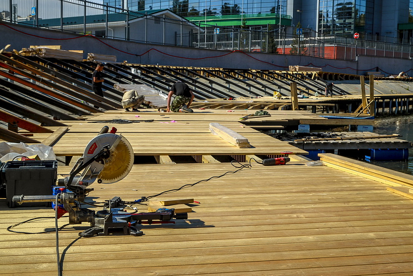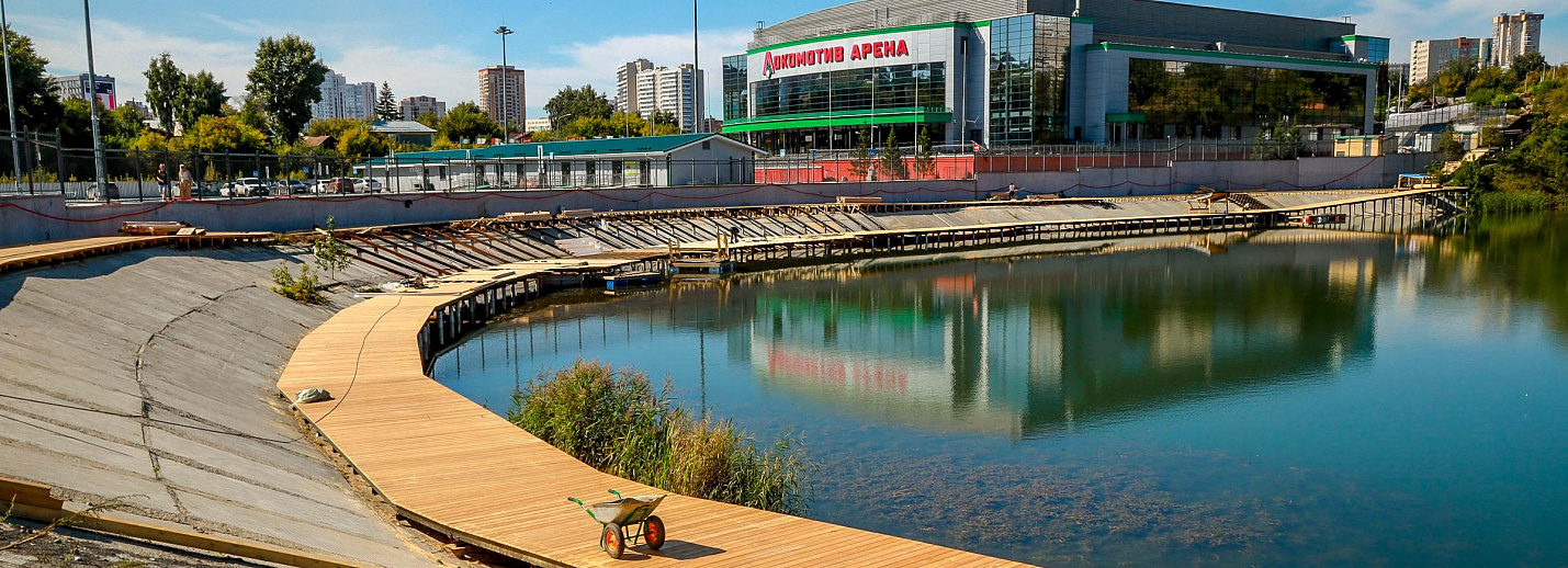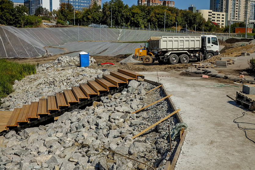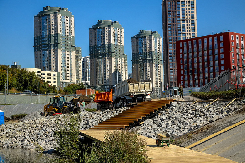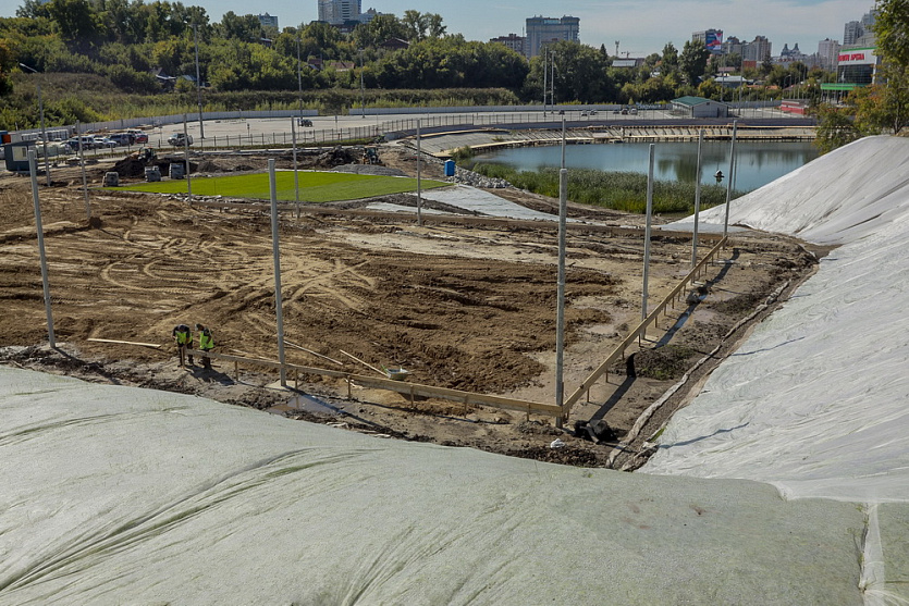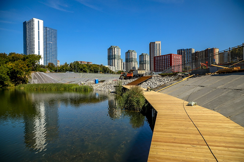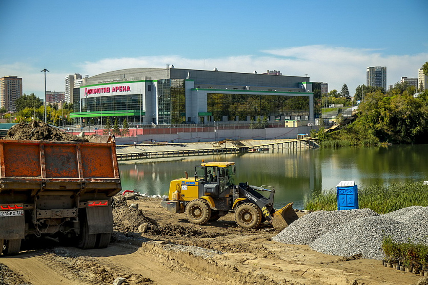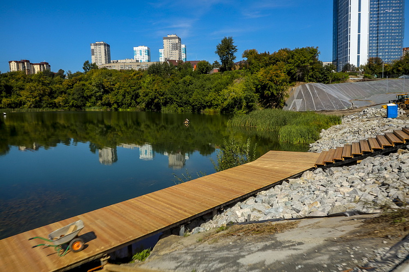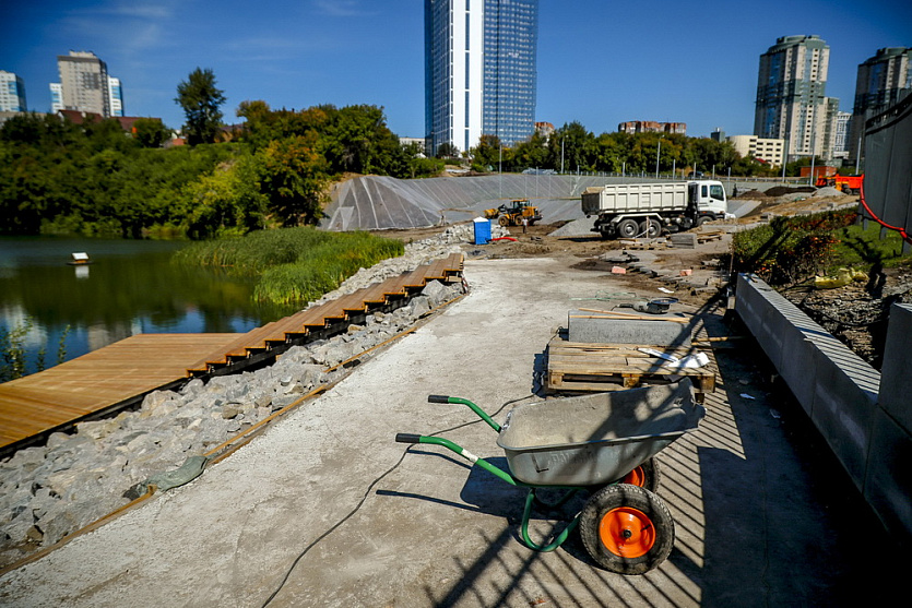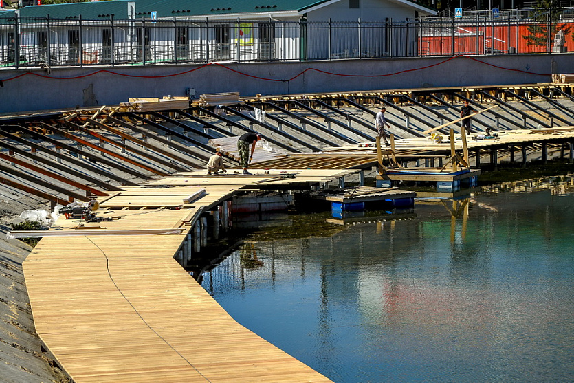 Сейчас на набережной укладывают газон, строят помосты и пирсы, укрепляют откосы, обустраивают пешеходные зоны и волейбольные площадки, монтируют лестничные спуски. Вдоль ограждения высадили декоративные кустарники, проложили тротуары. На водной глади уже появились домики для уточек.