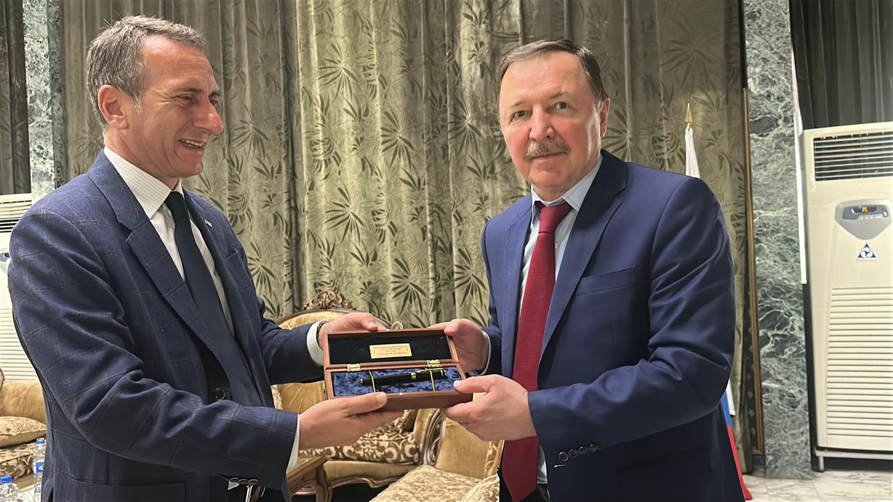В завершение встречи, как символ культурных и дружеских связей, Министр Олег Барциц преподнес Послу памятный подарок — деревянное изделие, сделанное абхазскими ремесленниками.