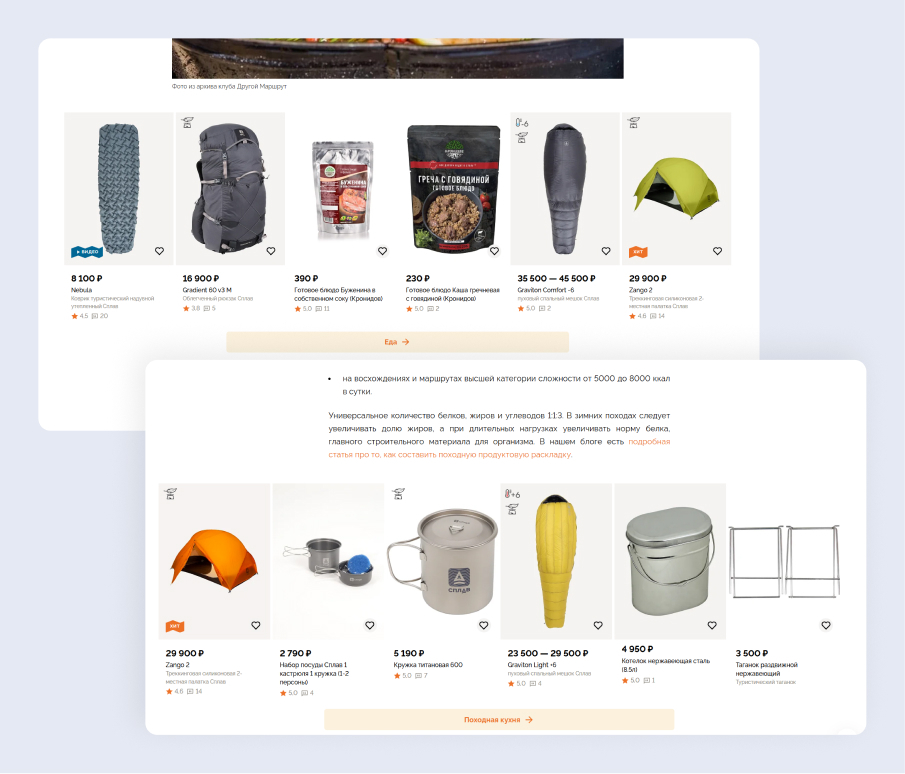 Врезки в статье с походными рецептами в блоге на сайте магазина «Сплав». Кроме товаров для приготовления еды в походе — обязательное снаряжение туриста в виде палатки и спальника