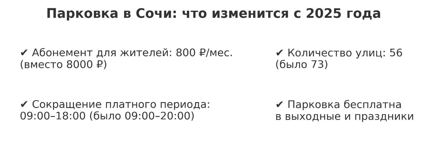 В конце августа 2025 года власти Сочи объявили о решении радикально снизить стоимость парковки для горожан. Теперь жители курорта будут платить за стоянку не более 800 рублей в месяц или 8 тысяч рублей в год — сумма, которая в десять раз меньше нынешней. Об этом сообщил мэр Андрей Прошунин во время «Прямой линии» с жителями.