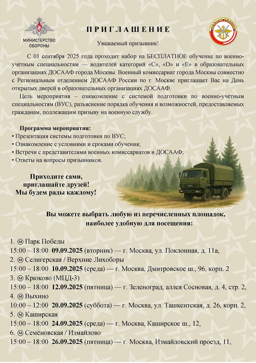 Военный комиссариат Зеленоградского административного округа города Москвы проводит «День открытых дверей» в ПОУ «ЦАМК ДОСААФ России» и системе подготовки граждан по ВУС в городе Москве.