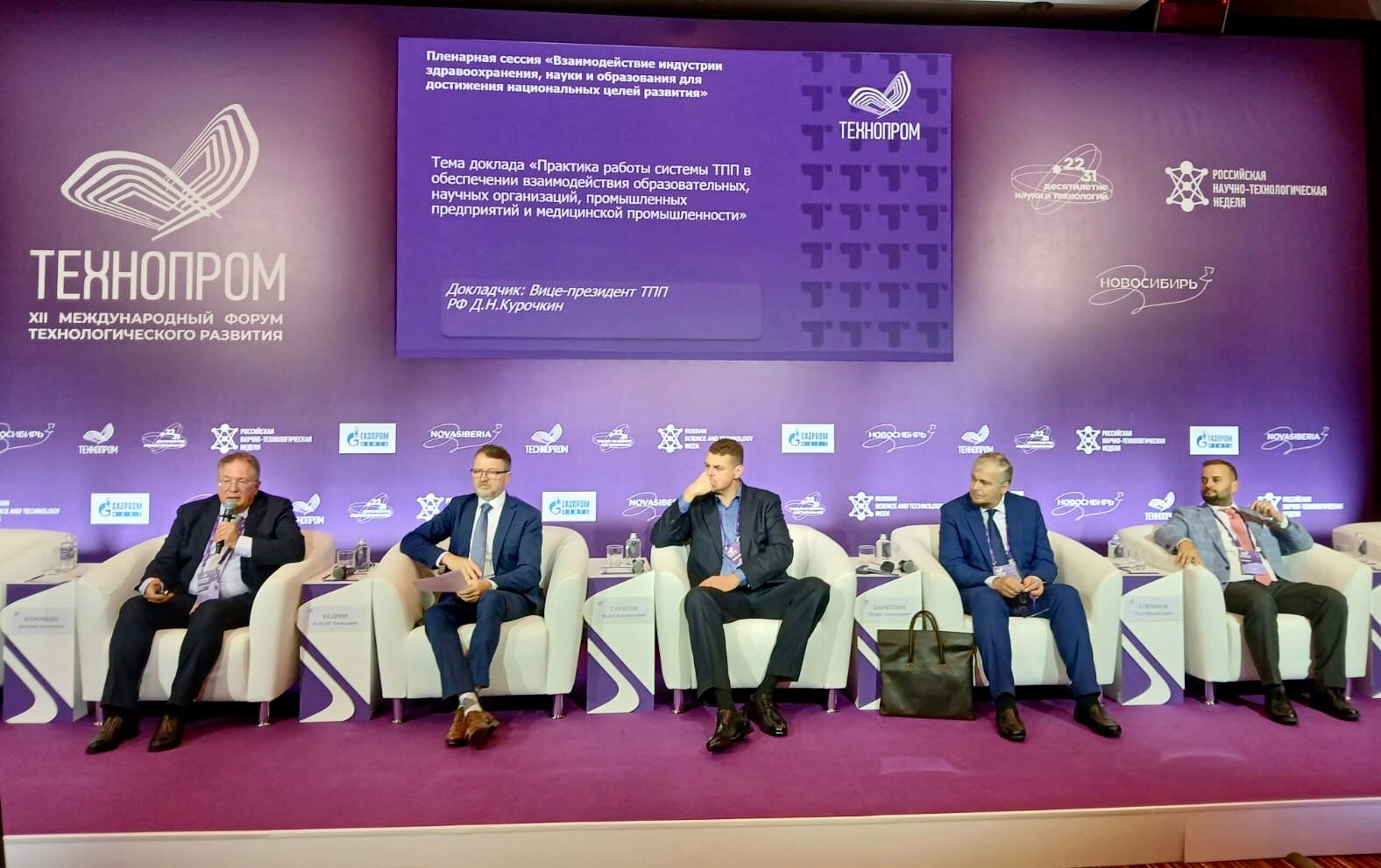 В панельной сессии принял участие вице-президент ТПП РФ Дмитрий Курочкин, сообщивший, что для достижения национальных целей развития система ТПП обеспечивает взаимодействие научных, образовательных организаций и предприятий реального сектора экономики в сфере здравоохранения, взаимодействуя с научно-образовательными центрами мирового уровня (НОЦ). Палаты находят индустриальных партнеров для организации производства, оказывают содействие в привлечении дополнительного финансирования институтов развития, выявляют потенциальных потребителей созданной НОЦ научно-технической продукции. Он привел конкретные примеры уникальных разработок НОЦ в сфере здравоохранения.