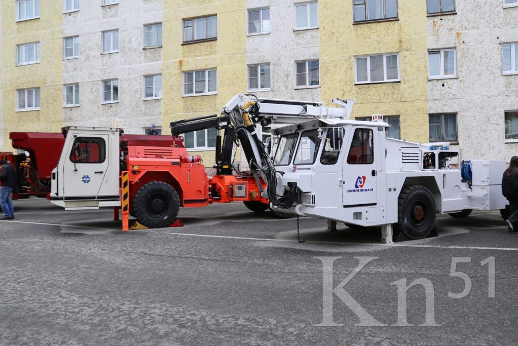 Традиционно на главной площади Заполярного проходит выставка горной, грузовой и спасательной техник. Из горной техники тут можно увидеть ножничный подъемник, механизированную зарядку, самоходную буровую установку.