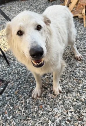Огромный белый пес с самыми добрыми в мире глазами встречает нас на пороге участка, который находится на улице Спартака.
