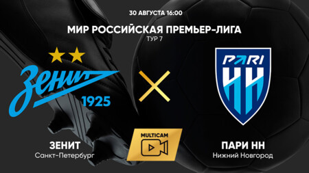 Петербургский «Зенит» и «Пари НН» играют вничью после первого тайма матча седьмого тура МИР Российской премьер‑лиги (РПЛ).