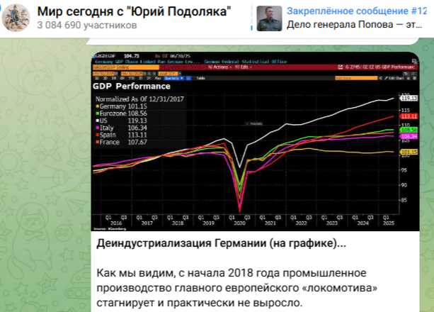 Военный журналист Юрий Подоляка подвёл итог санкционных ударов по России со стороны Европы, ключевым промышленным локомотивом которой считается Германия. В своём Telegram-канале он опубликовал инфографику Bloomberg, отражающую динамику производства в ряде западных стран.