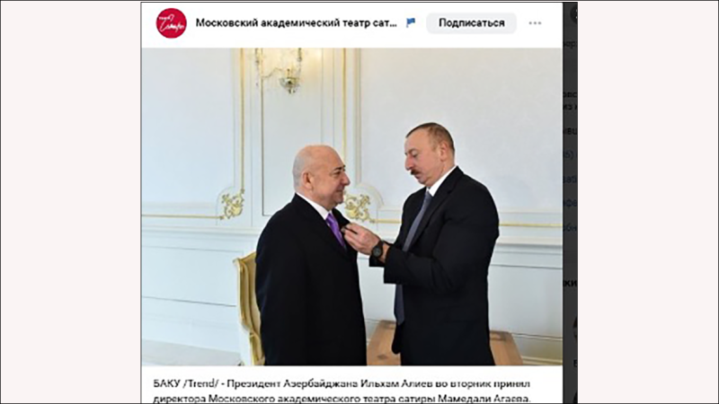 В Москве задержан Мамедали Агаев, бессменно руководивший Театром сатиры почти 30 лет. Его подозревают в мошенничестве. По данным следствия, долгие годы он проворачивал нехитрую схему. В качестве ИП заключал с собственным театром липовые договоры на написание сценариев и присваивал миллионы бюджетных рублей. Красной нитью через эту историю проходит связь Агаева с Азербайджаном. Президент республики Ильхам Алиев лично награждал его орденом.