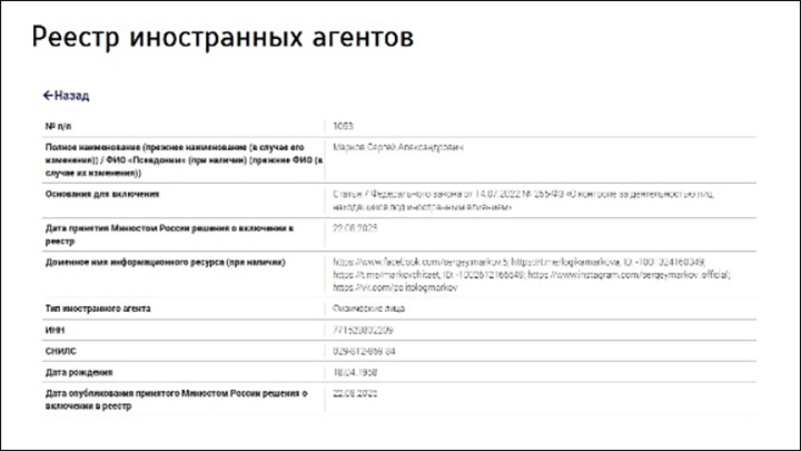 Теперь и Марков* в реестре. Скриншот: реестр иностранных агентов
