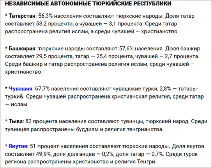 Из чего можно сделать вывод, что не только Азербайджан президент Турции Реджеп Эрдоган хочет вывести из-под влияния России, но и целый ряд русских регионов! Вот, к примеру, турецкий ресурс Karar, не стесняясь, называет "автономными тюркскими республиками, не имеющими независимости" сразу десять русских регионов.