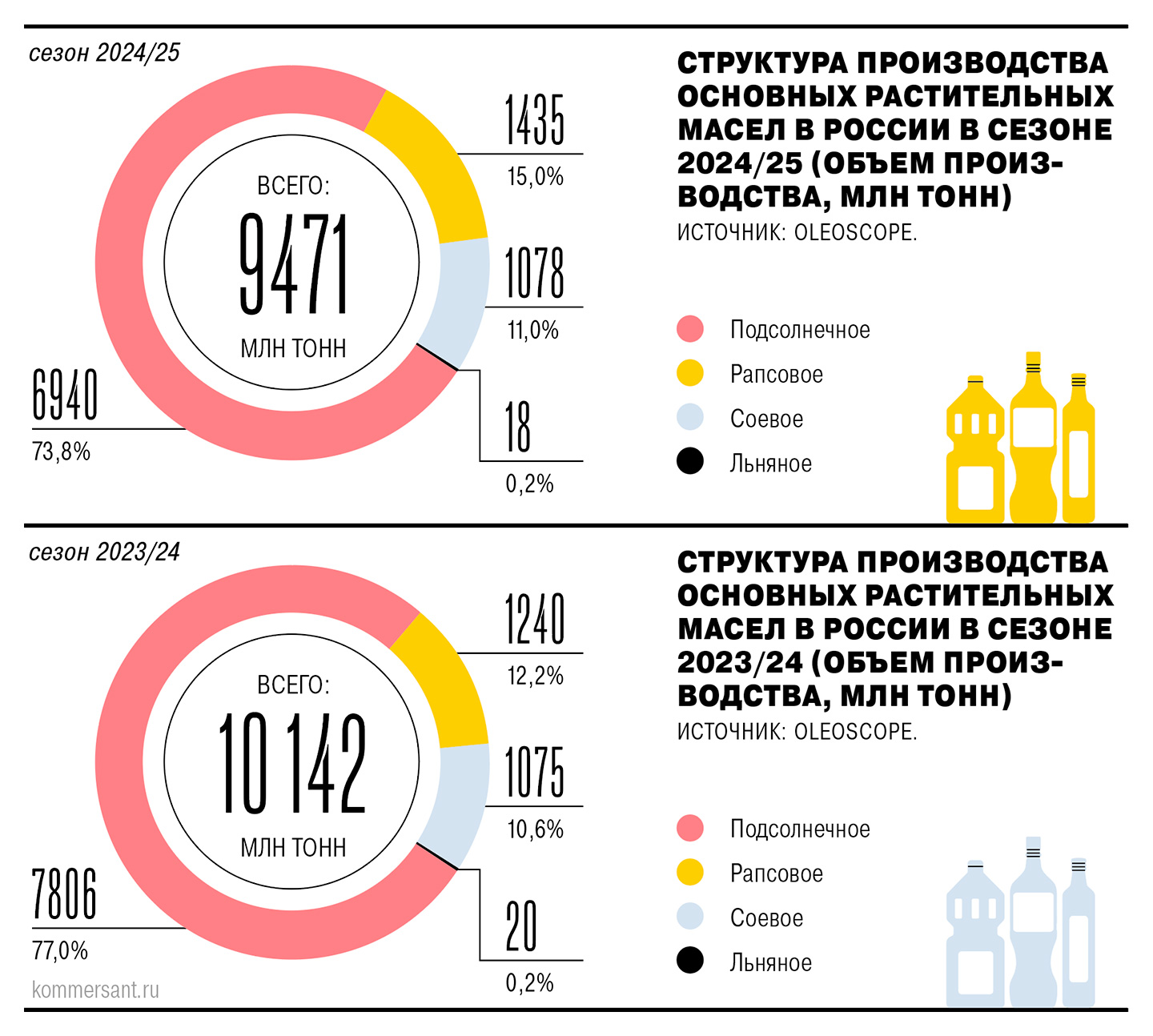 Объем производства основных видов растительных масел в России по итогам сельскохозяйственного сезона (период с сентября 2024 года по август 2025 года) составил 9,47 млн тонн, сократившись на 7% год к году, подсчитали в OleoScope. Совокупный объем переработки потерял 5,7%, до 26,3 млн тонн. Тренд в целом обусловлен в первую очередь падением выпуска подсолнечного масла на 11% год к году, до 6,94 млн тонн. Оценка Центра ценовых индексов — 7,2 млн тонн.