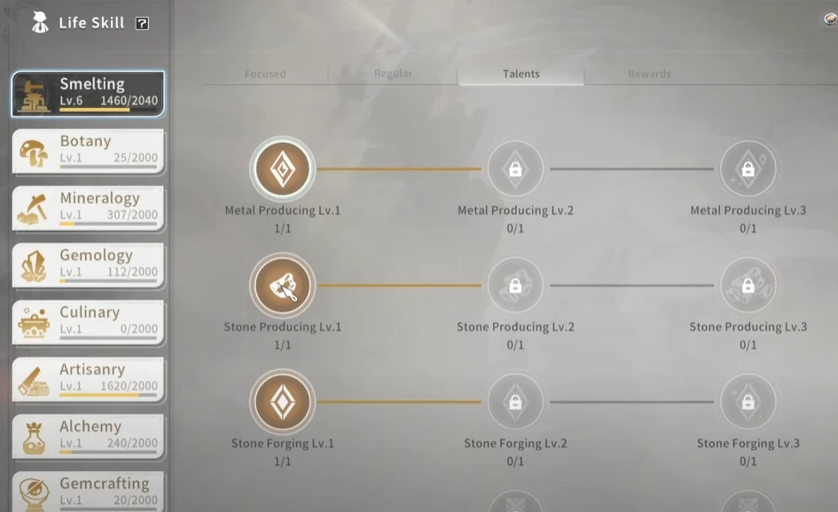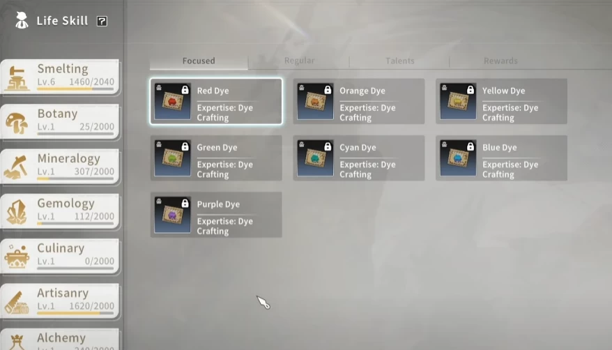 У каждой профессии вы найдёте 2 важных раздела — Focused и Regular. В обоих находятся айтемы для крафта, но между ними есть разница. Предметы в разделе Regular можно создавать не тратя на это выносливость. Предметы в разделе Focused можно создать только с помощью стамины и нужных ингредиентов. Одна большая разница этих двух разделов — предметы из Focused можно продавать другим игрокам на аукционе.
