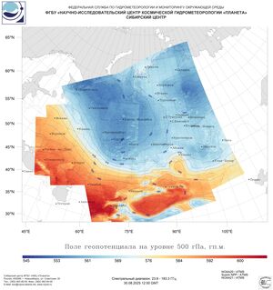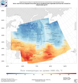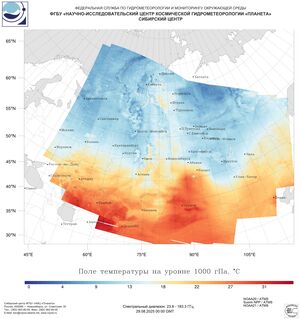 В сложившихся условиях атмосферной циркуляции наиболее крупные положительные аномалии температуры воздуха, более 4-6°С, наблюдались 28 августа. В западных районах Сибирского федерального округа в очаге тепла, над Новосибирской областью, отклонения средних многолетних значений температуры воздуха от норм дня соответствовали 8.2°С. На востоке округа аномальное распределение температуры воздуха, достигавшее 10°С, отмечалось на юге Таймырского Долгано-Ненецкого М.Р. Такая погода для северного региона считается очень теплой. При поддержке юго-западного выноса воздушных масс 29 числа в Томской области отклонения от норм сохранялись в интервале 5-6°С. В прошедшие сутки, 30 августа, с углублением тропосферной ложбины статистические показатели в западных районах округа заметно снизились, интенсивно приближаясь к климатическим нормам. Над Томской областью еще наблюдался максимум, до 3°С. В Новосибирской и Омской областях после прохождения холодного фронта уже сформировалась отрицательная температурная аномалия, достигавшая 1.7°С.