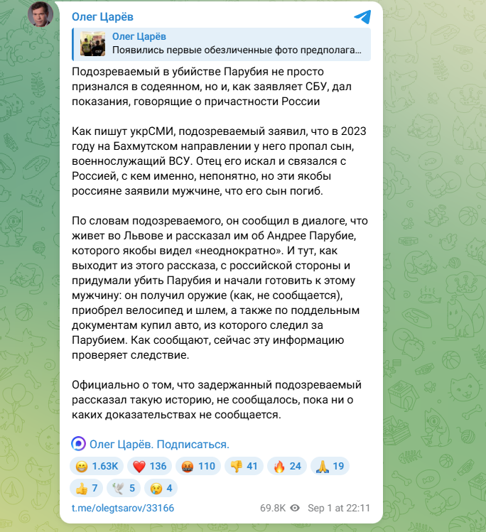 Как выходит из этого рассказа, с российской стороны и придумали убить Парубия и начали готовить к этому мужчину: он получил оружие (как, не сообщается), приобрёл велосипед и шлем, а также по поддельным документам купил авто, из которого следил за Парубием. Как сообщают, сейчас эту информацию проверяет следствие,