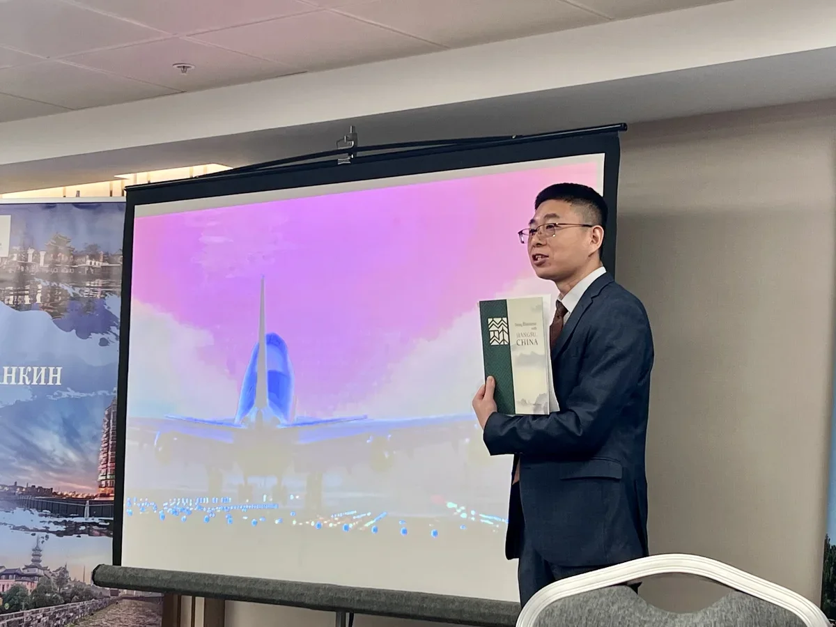 Глава торгово-экономического представительства Цзянсу в РФ и странах СНГ Цзя Инькэ рассказывает о потенциале провинции в плане индустриального туризма. Фото: АТОР