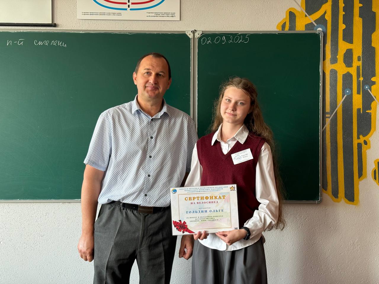Александр Юрчик поздравил Ольгу с заслуженной победой, вручил сертификат на велосипед и пожелал успехов в новом учебном году.
