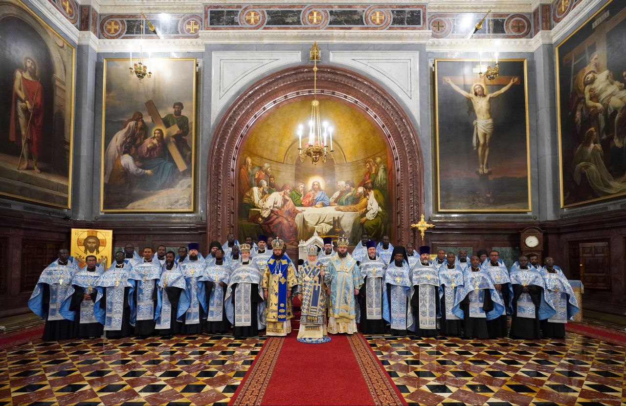 Вечером, в канун праздника Успения Пресвятой Богородицы, Святейший Патриарх Кирилл совершил всенощное бдение в кафедральном соборном Храме Христа Спасителя в Москве. В числе сослуживших Его Святейшеству были митрополит Каирский и Северо-Африканский Константин и члены делегации Патриаршего экзархата Африки. На богослужении присутствовали послы Бенина, ЦАР и Бурунди в России, а также представители Посольств Кот д’Ивуара, ЮАР, Руанды, Анголы и Мадагаскара.