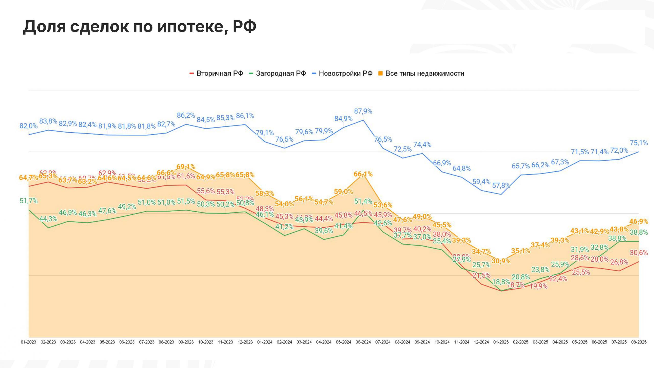 Отдельно он отметил ипотечные сделки. В августе 2025 года их доля по «вторичке» составила 30,6%, тогда как на пике весной этого года показатель опускался ниже 20%. В сегменте новостроек она остается значительно выше — около 75%.