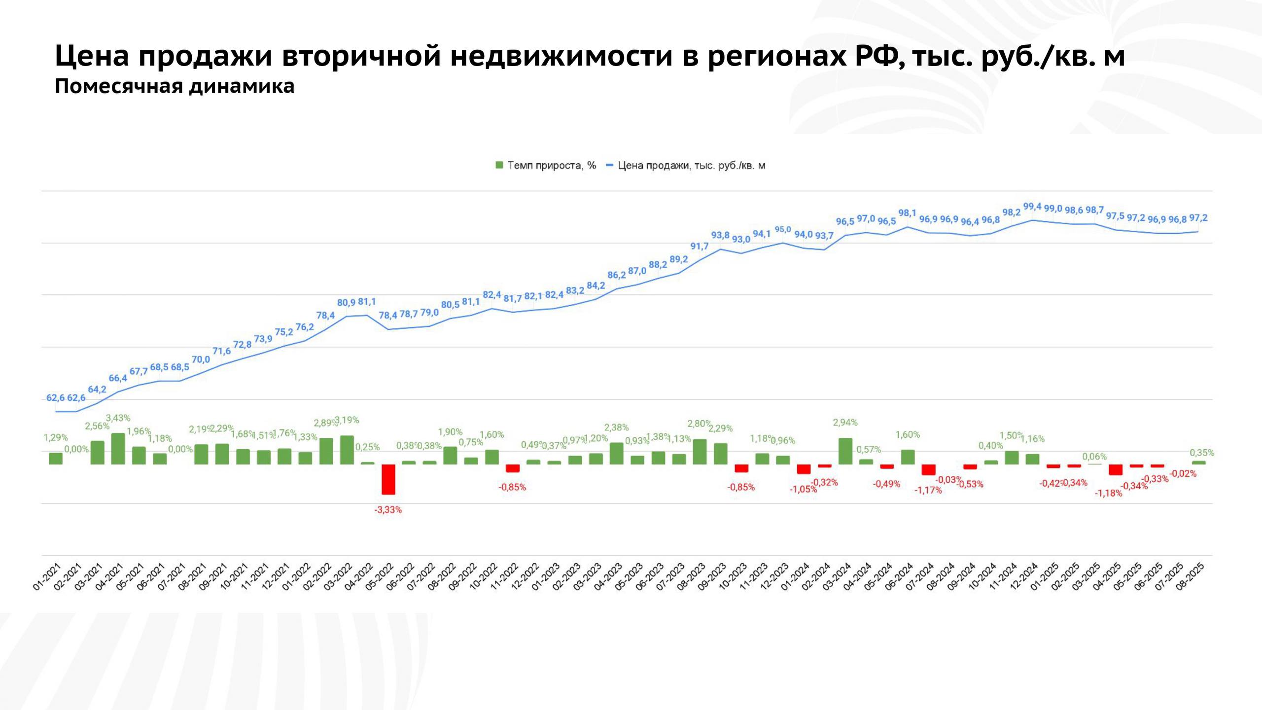 Бизнесмен отмечает: еще в июле стало заметно, что снижение цен замедляется, а август подтвердил разворот тренда. По его данным, средняя стоимость квадратного метра на вторичном рынке в регионах РФ в августе составила 97,2 тыс. руб., а на первичном — 154,9 тыс. руб. При этом динамика цен на вторичное жилье в последние месяцы остается более устойчивой: если с начала 2024 года на «вторичке» фиксировались колебания в пределах 1,5%, то на рынке новостроек рост был более выраженным, с отдельными просадками в начале 2025-го.