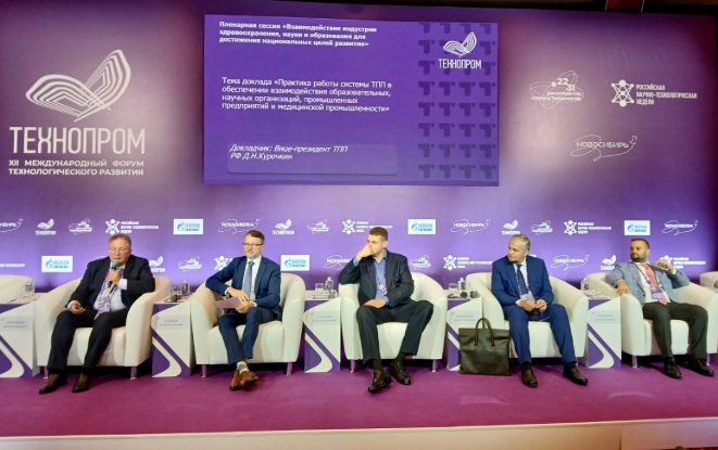 В панельной сессии принял участие вице-президент ТПП РФ Дмитрий Курочкин, сообщивший, что для достижения национальных целей развития система ТПП обеспечивает взаимодействие научных, образовательных организаций и предприятий реального сектора экономики в сфере здравоохранения, взаимодействуя с научно-образовательными центрами мирового уровня (НОЦ). Палаты находят индустриальных партнеров для организации производства, оказывают содействие в привлечении дополнительного финансирования институтов развития, выявляют потенциальных потребителей созданной НОЦ научно-технической продукции. Он привел конкретные примеры уникальных разработок НОЦ в сфере здравоохранения.