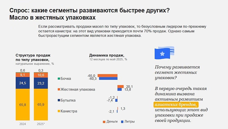 Согласно отчёту, наиболее значительный рост спроса зафиксирован у моторного масла в жестяной упаковке: в денежном выражении увеличение объёма их продаж за отчётный период составило 20,1%, а по количеству проданных литров прибавка оказалась равна 13,8%. При этом в самом популярном сегменте – масло в канистрах – увеличение продаж в денежном выражении составило 1,3%, а по реализованным литрам динамика отрицательная – спад составил 2,1%.